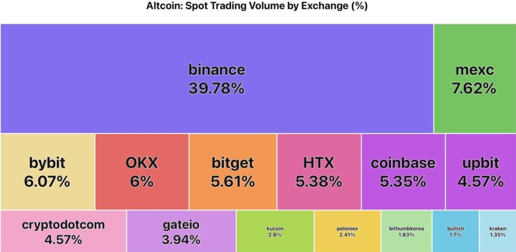 Зростання частки Binance до 40% у загальному обсязі торгів альткоїнами створює враження, що біржа стає сильнішою. В реальності це відображає наслідок загального скорочення ринку та виходу капіталу з менш популярних платформ.