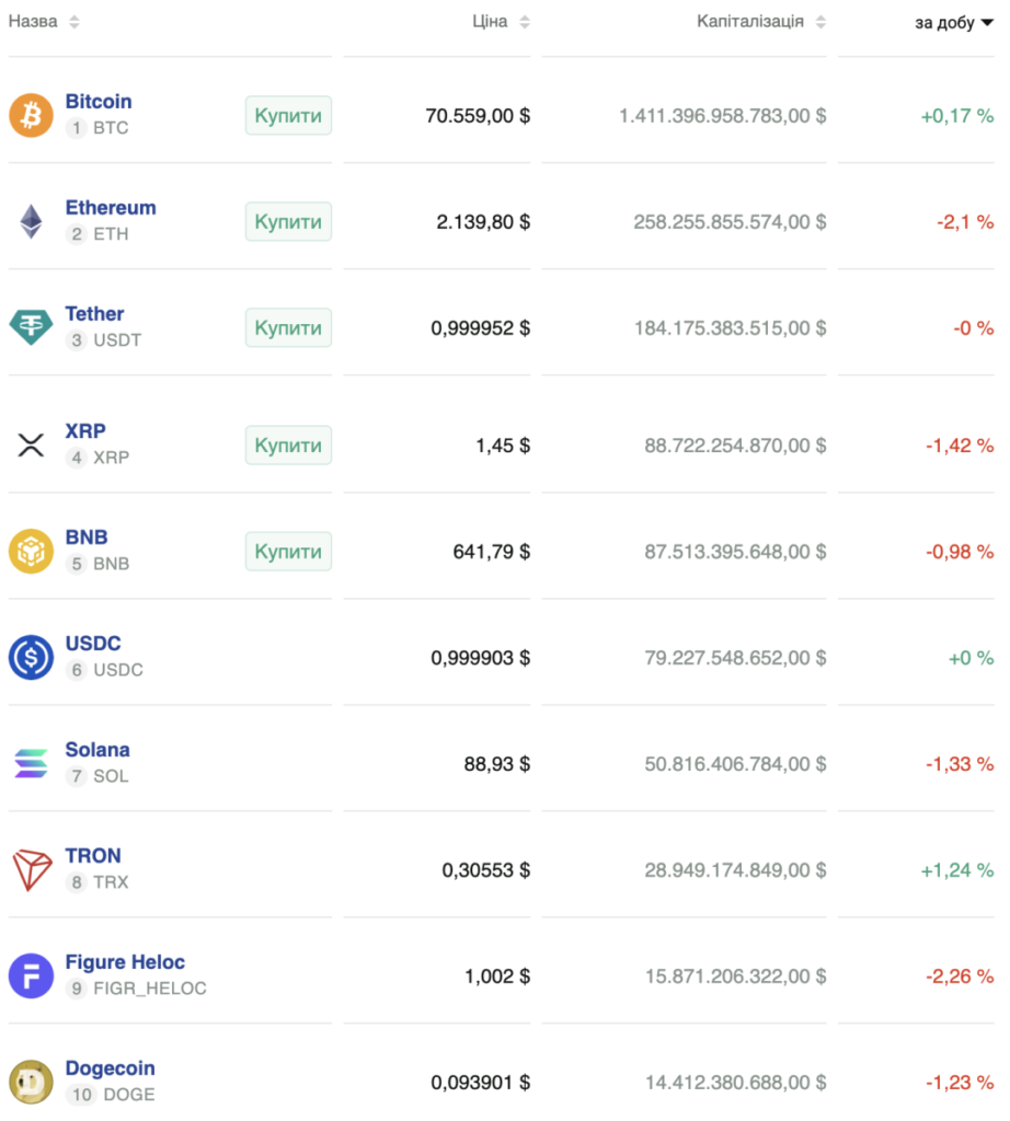 - Біткоїн торгується на рівні $70 560, практично без змін.